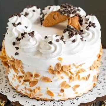 A classic vanilla sponge cake filled with Italian Cannoli Cream, iced with a light layer of whipped cream outside and topped with mini cannolis and toasted almond slices. (Serves 8-10 people)