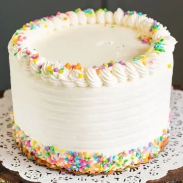 Fluffy layers of confetti Vanilla cake, filled with buttercream, iced in white buttercream and topped with funfetti sprinkles. (Serves 8-10 people)